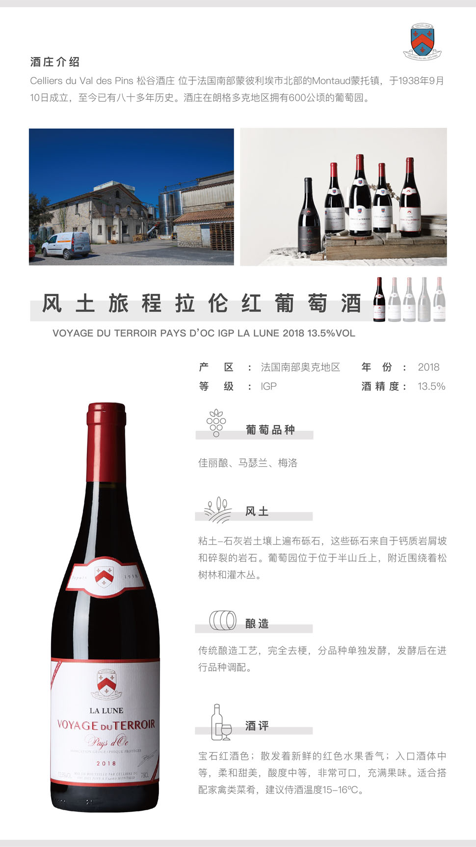 宝石红酒色;散发着新鲜的红色水果香气;入口酒体中等,柔和甜美,酸度中等,非常可口,充满果味。适合搭配家禽类菜肴,建议侍酒温度为16-18摄氏度。